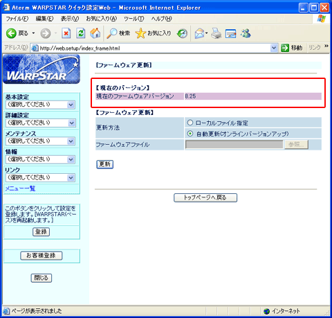 4.「メンテナンス」-「ファームウェア更新」をクリックします