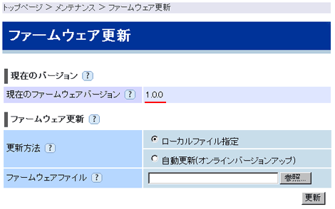 5.『ファームウェア更新』画面が開きます。「現在のファームウェアバージョン」より、現在のファームウェアバージョンの確認が行えます。