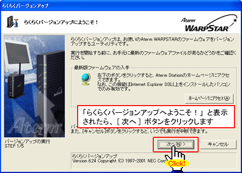 7.らくらくバージョンアップが起動したら、[次へ]ボタンをクリックします