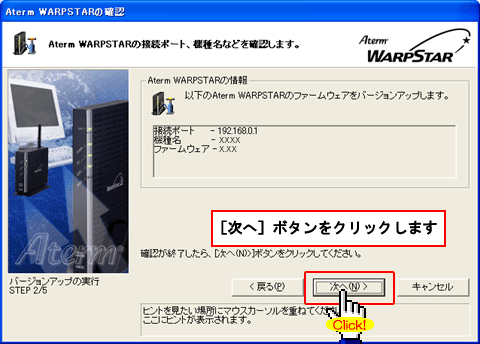 8.機種名と現在のファームウェアバージョンを確認し、[次へ]ボタンをクリックします