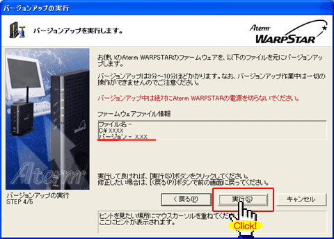 9.ファームウェアのバージョンを確認し、[実行]ボタンをクリックします