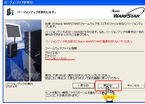 11.ファームウェアのバージョンを確認し、[実行]ボタンをクリックします