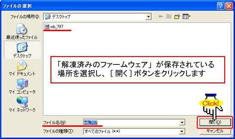 5.「解凍済みのファームウェア」が保存されている場所を選択し、[開く]ボタンをクリックします