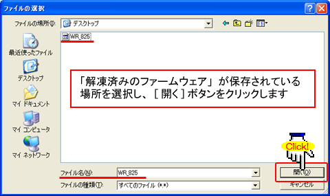 5.パソコンに解凍しておいたファームウェアを指定し、 [開く]ボタンをクリックします