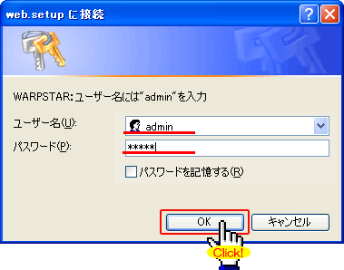 2.ユーザー名に[admin]、パスワードに「管理者用パスワード」を入力し、