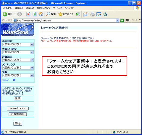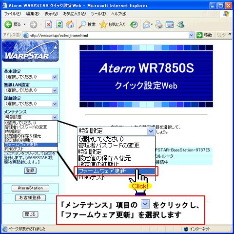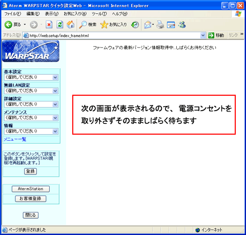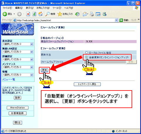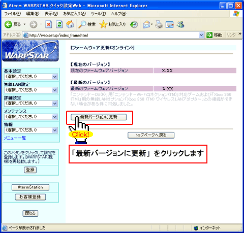- 当バージョンアップ画面は、Windows XPでAtermWR7850Sを使用した場合の画面です