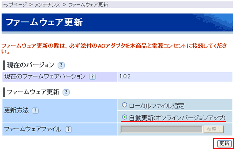 6.ファームウェアの最新バージョン情報を取得後に、以下のような画面が表示されます。表示されましたら、「最新バージョンへ更新」ボタンを押します。