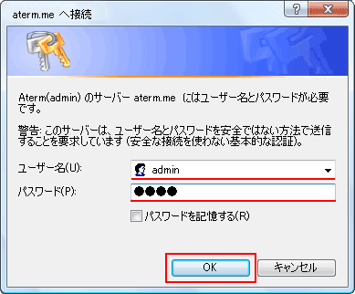 2.ログイン画面が表示されます。ユーザー名に「admin」、パスワードに「管理者パスワード」を入力して、【OK】ボタンを押してください。