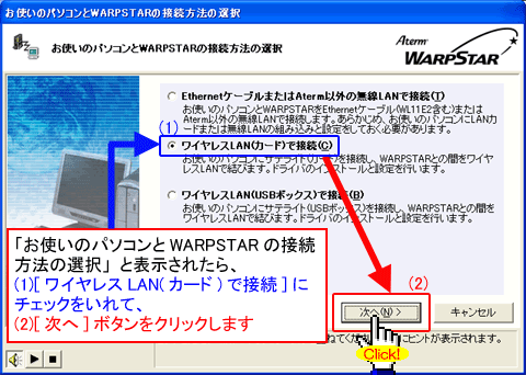 14.[ワイヤレスLAN(カード)で接続]にチェックを入れて、[次へ]ボタンをクリックします