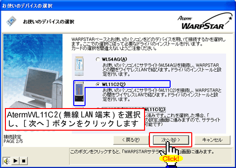 15.AtermWL11C2(無線LAN端末)を選択し、[次へ]ボタンをクリックします