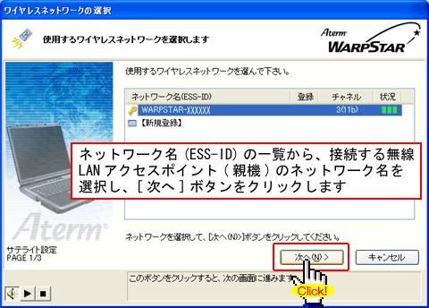 17.ネットワーク名(ESS-ID)の一覧から、接続する無線LANアクセスポイント(親機)のネットワーク名を選択し、[次へ]ボタンをクリックします