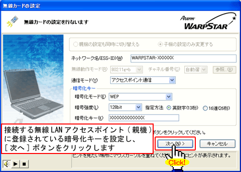 18.接続する無線LANアクセスポイント(親機)に登録されている暗号化キーを設定し、[次へ]ボタンをクリックします