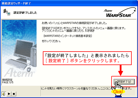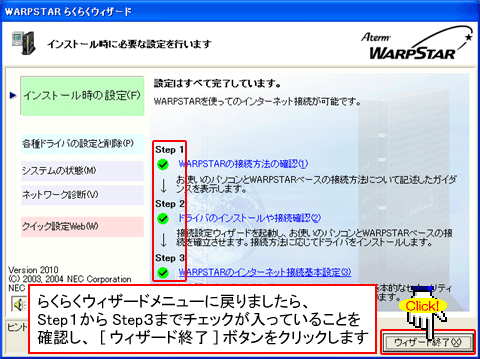 20.WARPSTARらくらくウィザード画面に戻ったら、 [ウィザード終了]ボタンをクリックします