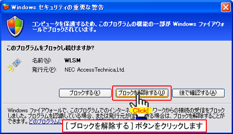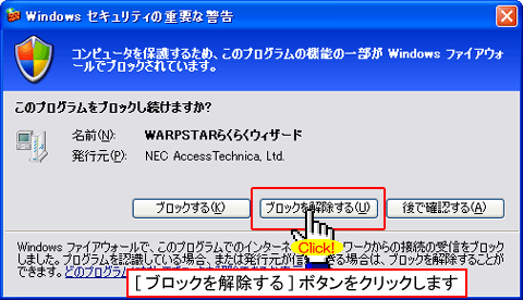 次のような画面が表示された場合は、[ブロックを解除する]ボタンをクリックします