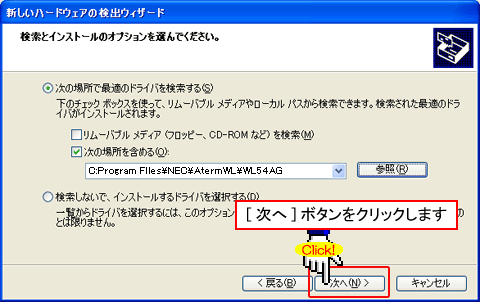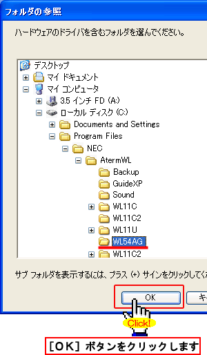 20-4.インストールしたいAtermWL54AGのドライバファイルを選びます。以下のとおり、ファイルを指定し[OK]ボタンをクリックしてください (例)「マイコンピュータ」-「ローカルディスク」-「Program Files」 - 「NEC」- 「AtermWL」-「WL54AG」を順にクリックし[OK]ボタンをクリック
