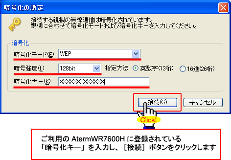 23.AtermWR7600Hに登録されている「暗号化キー」を入力し、 [接続]ボタンをクリックします(暗号化設定がされていない場合は表示されませんので、次の手順にすすんでください)