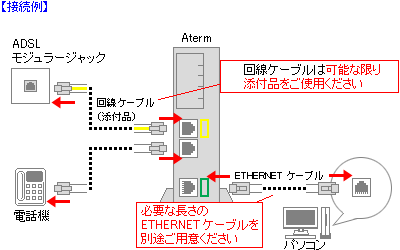 ADSLモジュラージャックからAtermの設置場所まで距離がある場合は、必要な長さのETHERNETケーブル(Atermとパソコン間をつなぐケーブル)を別途ご購入の上、ご使用いただくか、無線LANをご利用ください(無線LANの利用可否はご契約内容により異なります)。