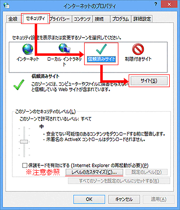 「信頼済みサイト」を選んだ後に、「サイト」ボタンを選択します。