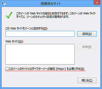 4.「信頼済みサイト」画面が表示されましたら、「このゾーンのサイトにはすべてのサーバーの確認(https:)を必要とする」のチェックを外します。