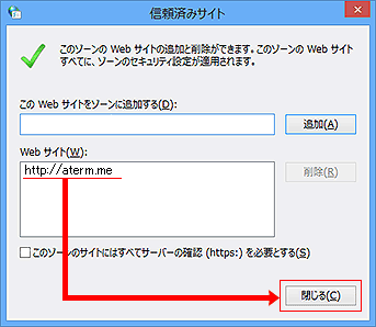 5.「次のWebサイトをゾーンに追加する」に「http://aterm.me/」と入力して「追加」ボタンを選択します。