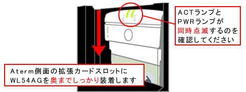 - 無線LANアクセスポイント(親機)の電源を入れて、WL54AGのACTランプとPWRランプが同時点滅するのが確認できれば、WL54AGは完全に装着されています。