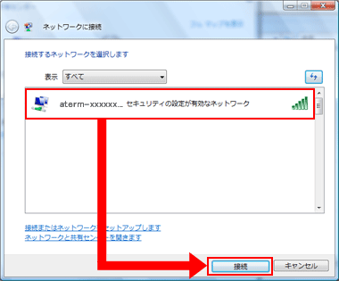 無線LAN内蔵パソコンで、Atermとの無線接続が確立できない場合、Windows Vista(R)の「ワイヤレスネットワークの選択」画面から設定を行うことで、確立できることがあります。
