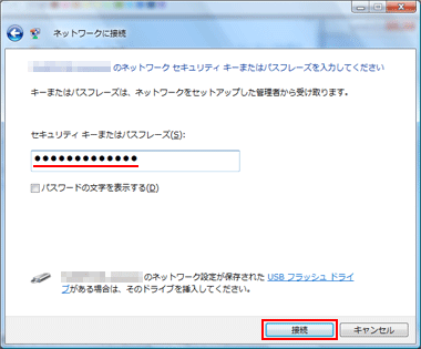 無線LANアクセスポイント(親機)に設定されている「暗号化キー」を入力して「接続」ボタンを選択します。