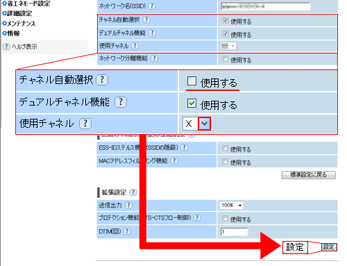 4.画面が表示されましたら、「チャネル自動選択」の「使用する」を選択し、チェックをはずします。「使用チャネル」を選び、「設定」ボタンを選択します。