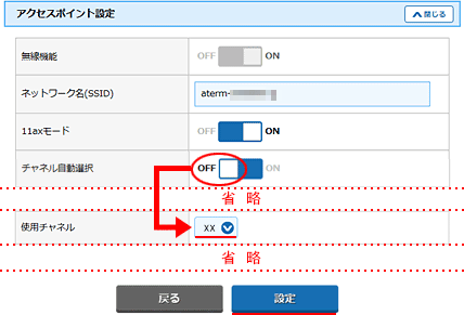 5.画面が表示されましたら、「チャネル自動選択」-「OFF」にします。「使用チャネル」を選び、「設定」ボタンを選択します。