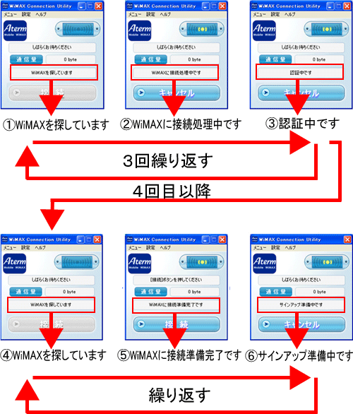 WiMAX Connection Utility<WiMAX通信ソフトウェア>が以下の表示を繰り返します。
