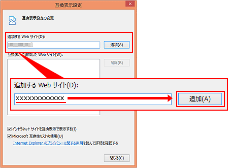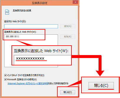 3.「互換表示に追加したWebサイト」欄に入力した内容が表示されましたら「閉じる」ボタンを選択します