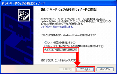 A :表示された場合は、「いいえ。今回は接続しません」を選択した後に、「次へ」ボタンを選択します。インストール作業が再開しますので、そのままお待ちください。