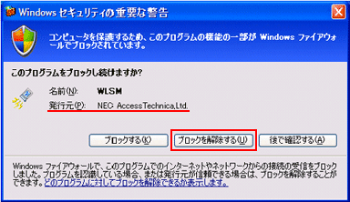 A :「発行元」が「NEC AccessTechnica,Ltd」と表示されているのをご確認の上、「ブロックを解除する」ボタンを選択してください。