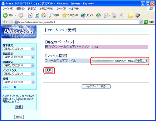 [ファームウェアファイル]で[参照]をクリックし、手順「9.」でダウンロードしたファイル「DR3XXCV_140bin」を選択し、[更新]をクリックします。 |