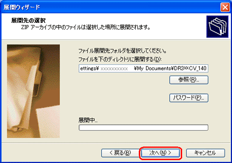 [次へ]をクリックしてください。変更する場合は[参照]をクリックして展開先を選択してください。 |