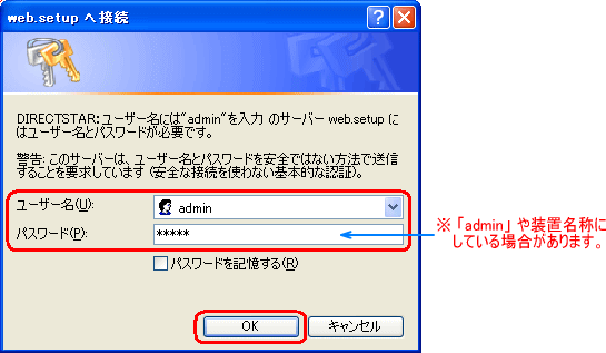 パスワードがわからない場合は、「admin」や装置名称にしている場合がありますので、お試しください。また、装置同梱の「つなぎかたガイド」にあるパスワード記入欄を確認してみてください。