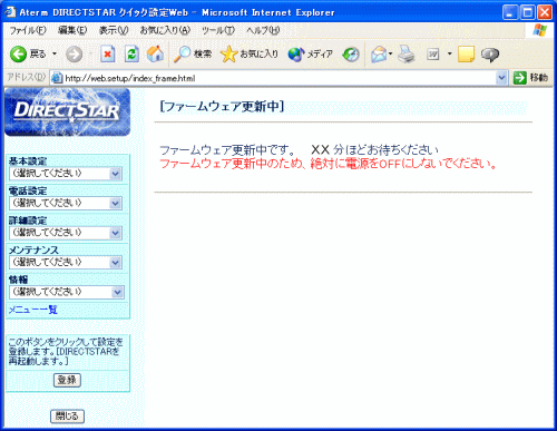 [メニュー一覧]の[メンテナンス]−[ファームウェア更新]画面へ戻ります。